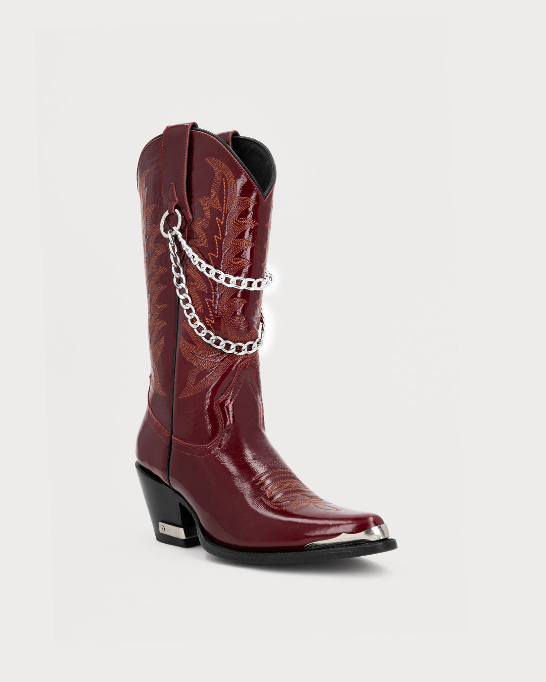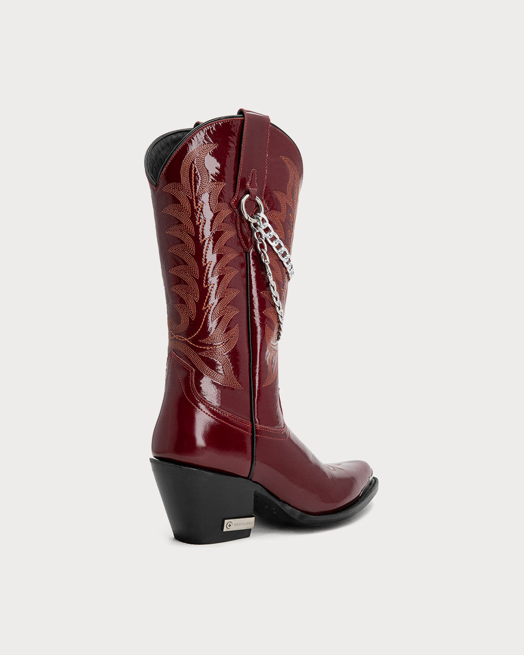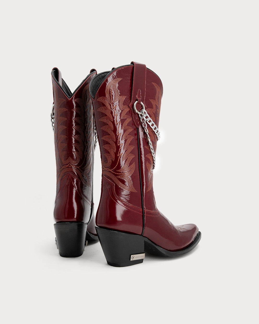 Botas rojas de mujer con aplicación de doble cadena variable y desmontable en oreja, bordado tradicional en tubo, punta puntal, placa metálica en tacón y acabado glossy.