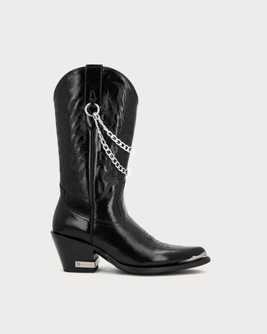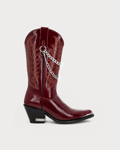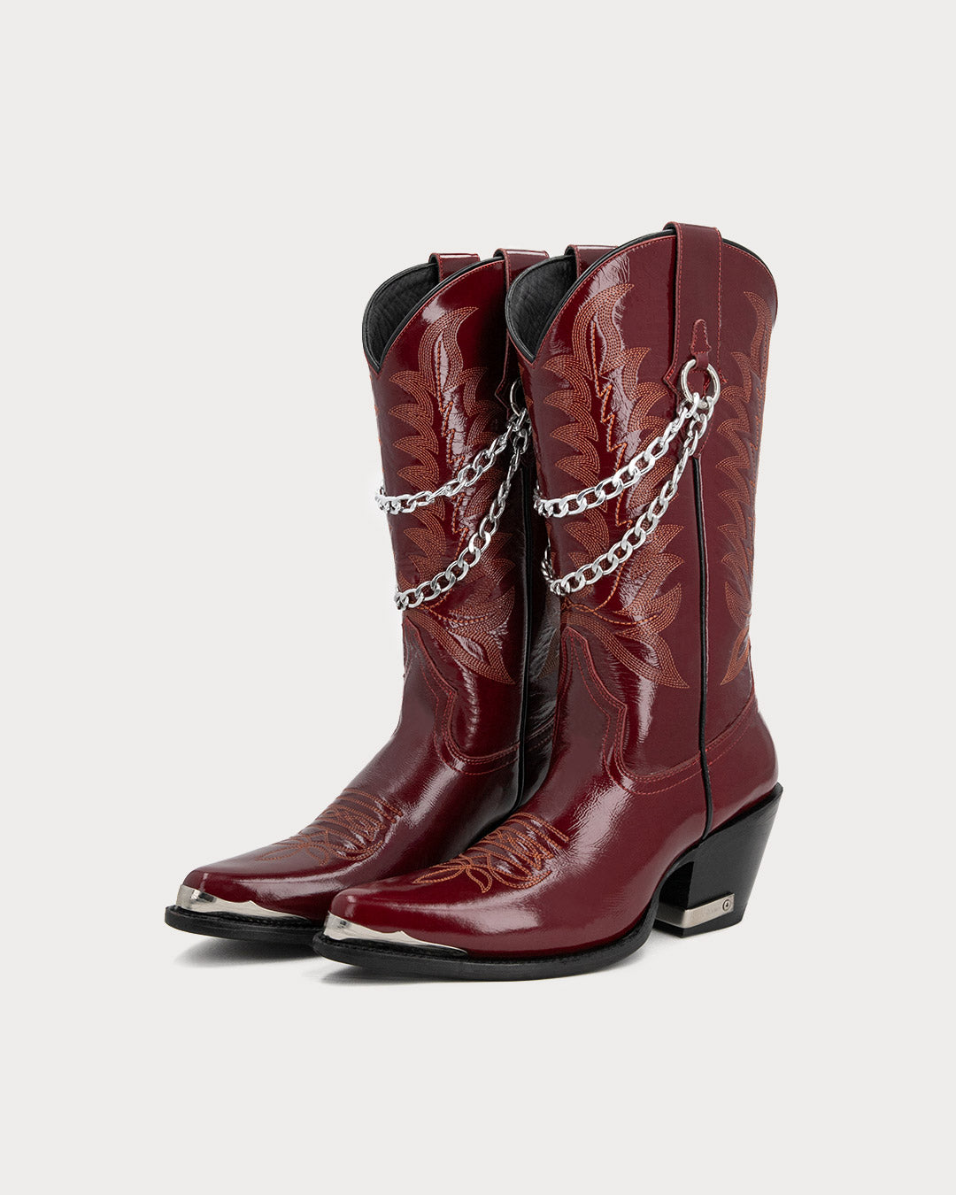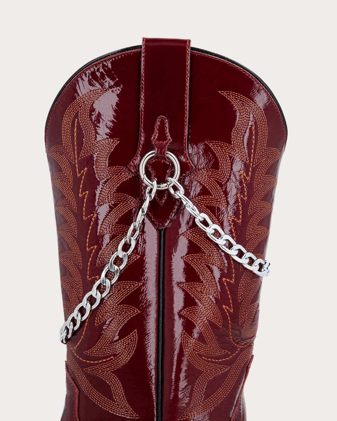 Botas rojas de mujer con aplicación de doble cadena variable y desmontable en oreja, bordado tradicional en tubo, punta puntal, placa metálica en tacón y acabado glossy.