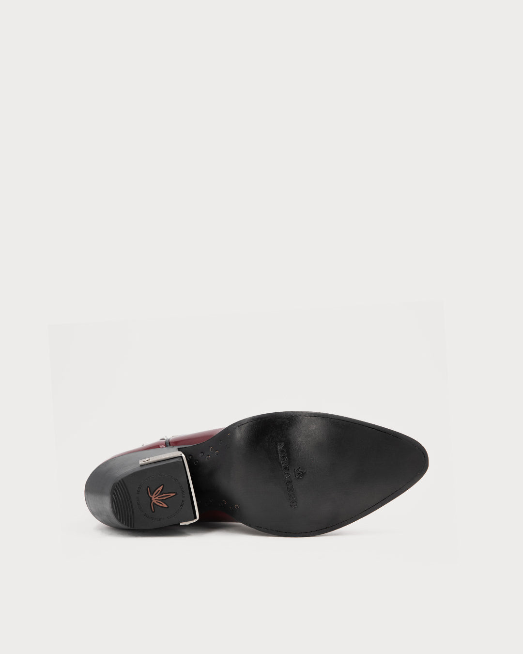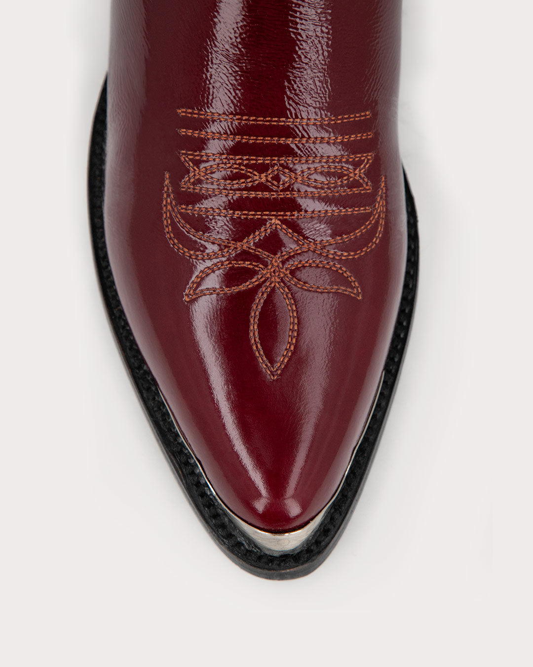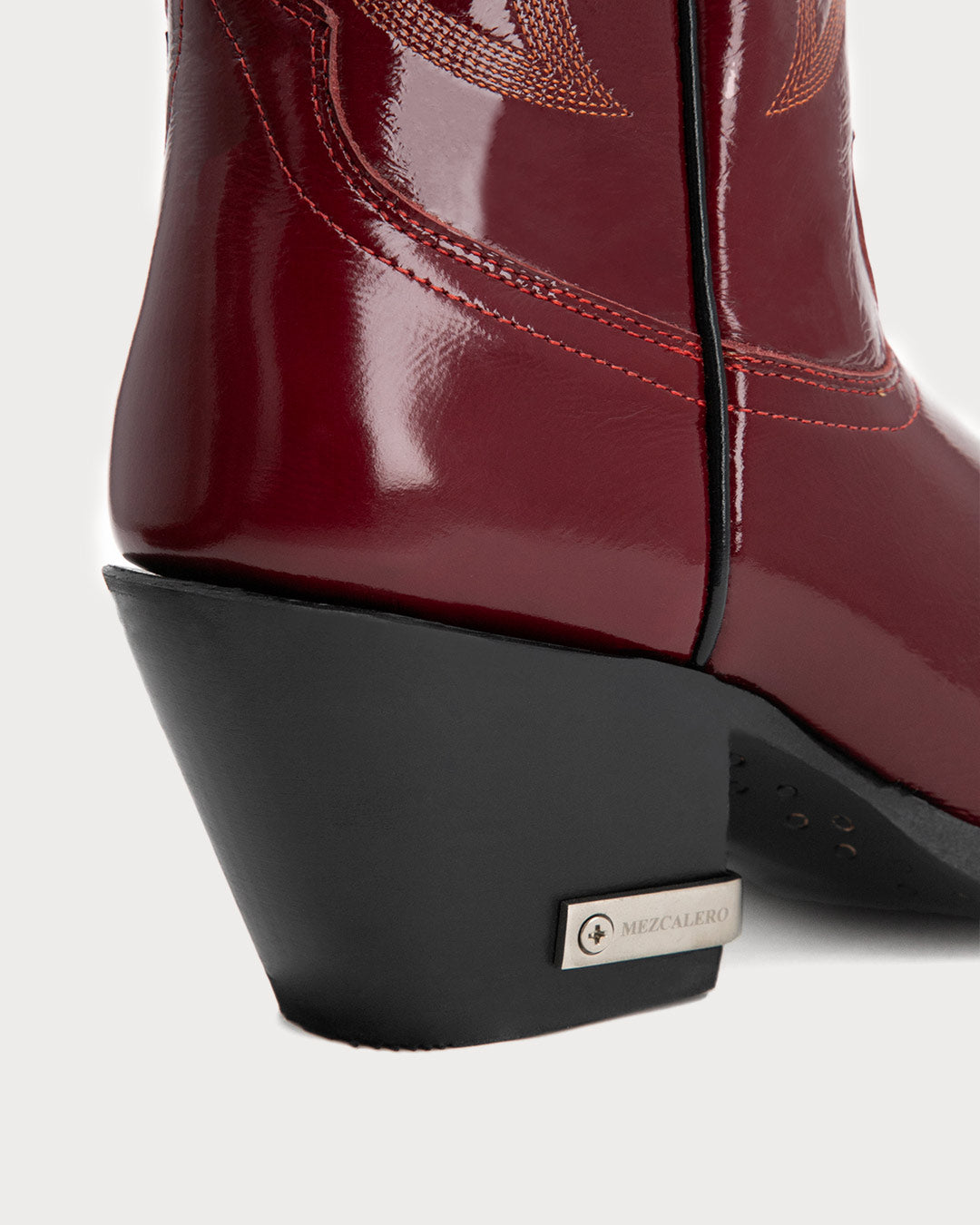 Selena Red, un par de botas de charol en tonalidad cherry con acabado gloss al alto brillo y una construcción slim fit, por la cuál se recomienda pedir una talla más de la habitual. Completa fabricación en piel, por manos artesanas en Atelier Mezcalero.