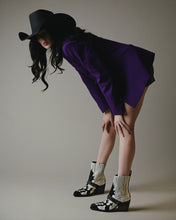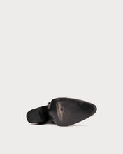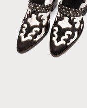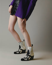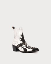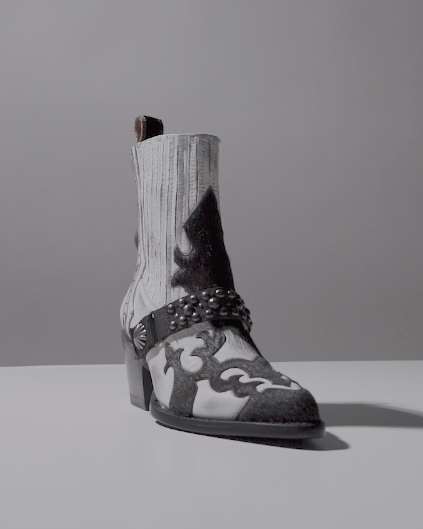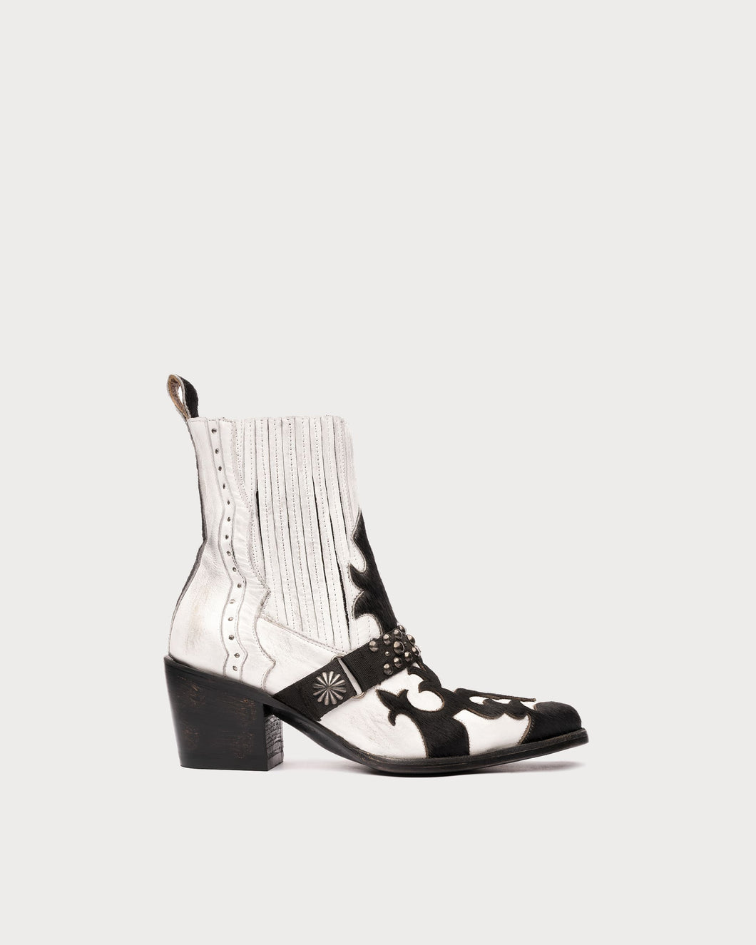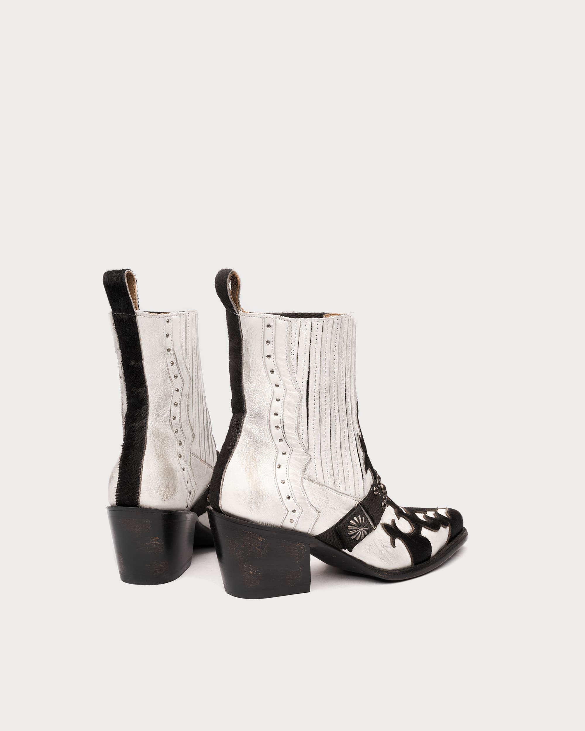 - Botines blancos de piel con acabado tipo vintage, aplicación de figura western con piel en pelo negro al frente, tira de velcro ajustable con remaches vintage en empeine, elásticos de cartera y punta afilada.