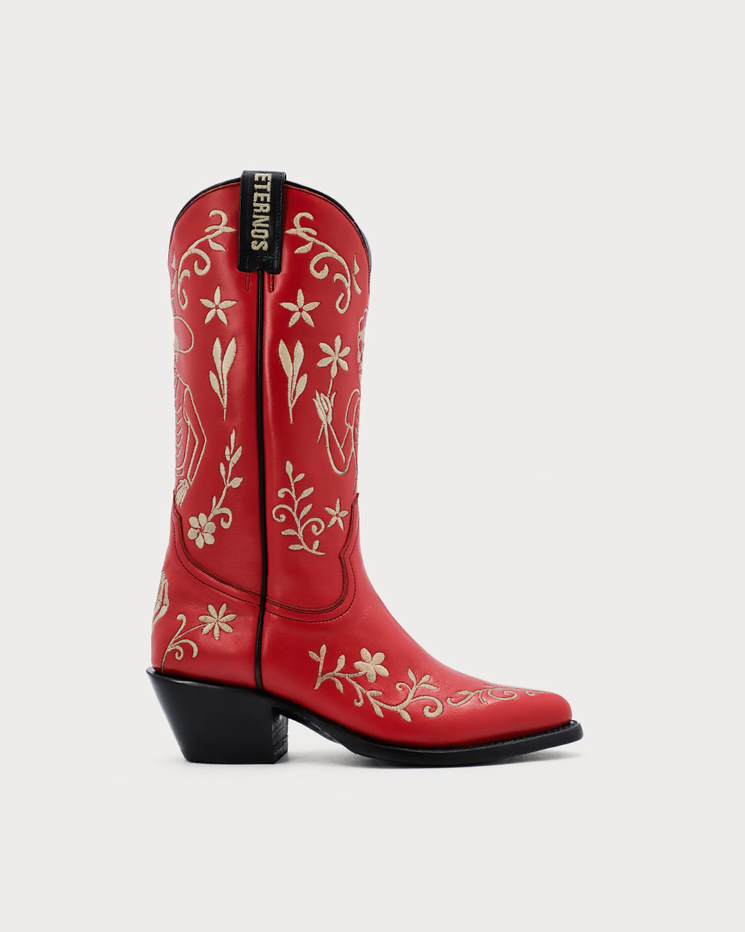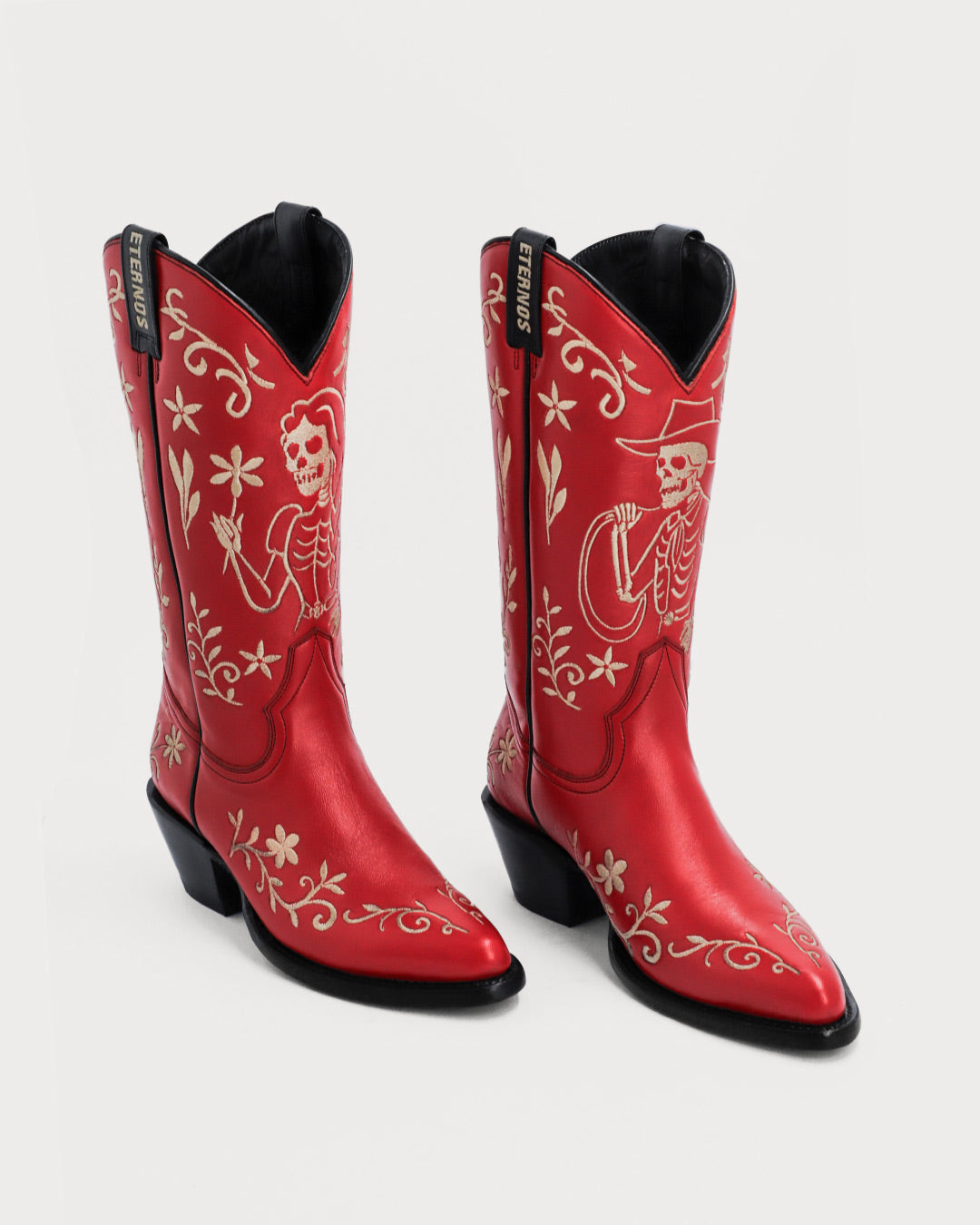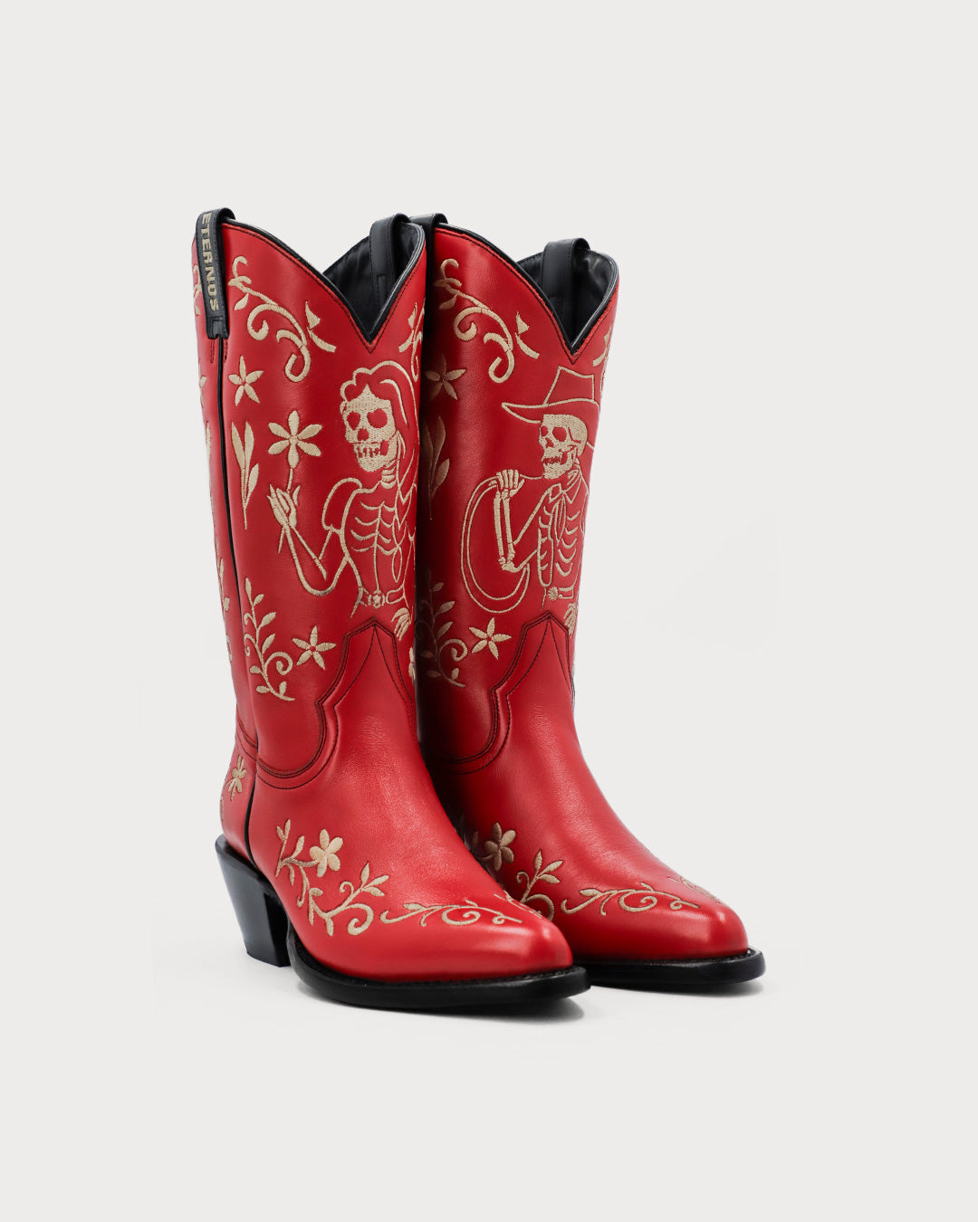 Eterna es una bota de edición limitada, creada para conmemorar la temporada de octubre e inspirada en la esencia del Día de Muertos. Elaborada en piel color rojo cereza, con un bordado en tono arena que resalta su diseño y refleja el contraste entre lo eterno y lo terrenal.
