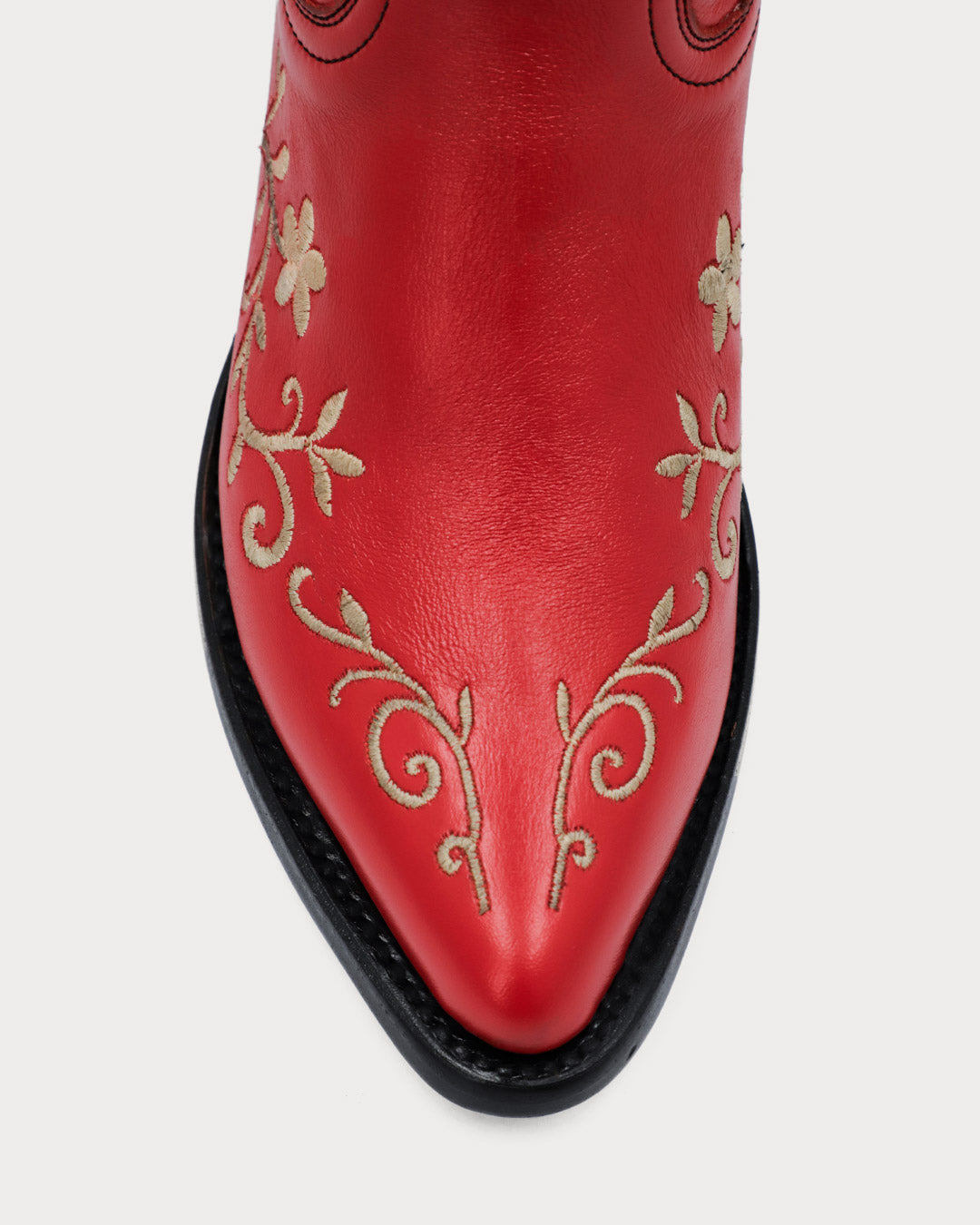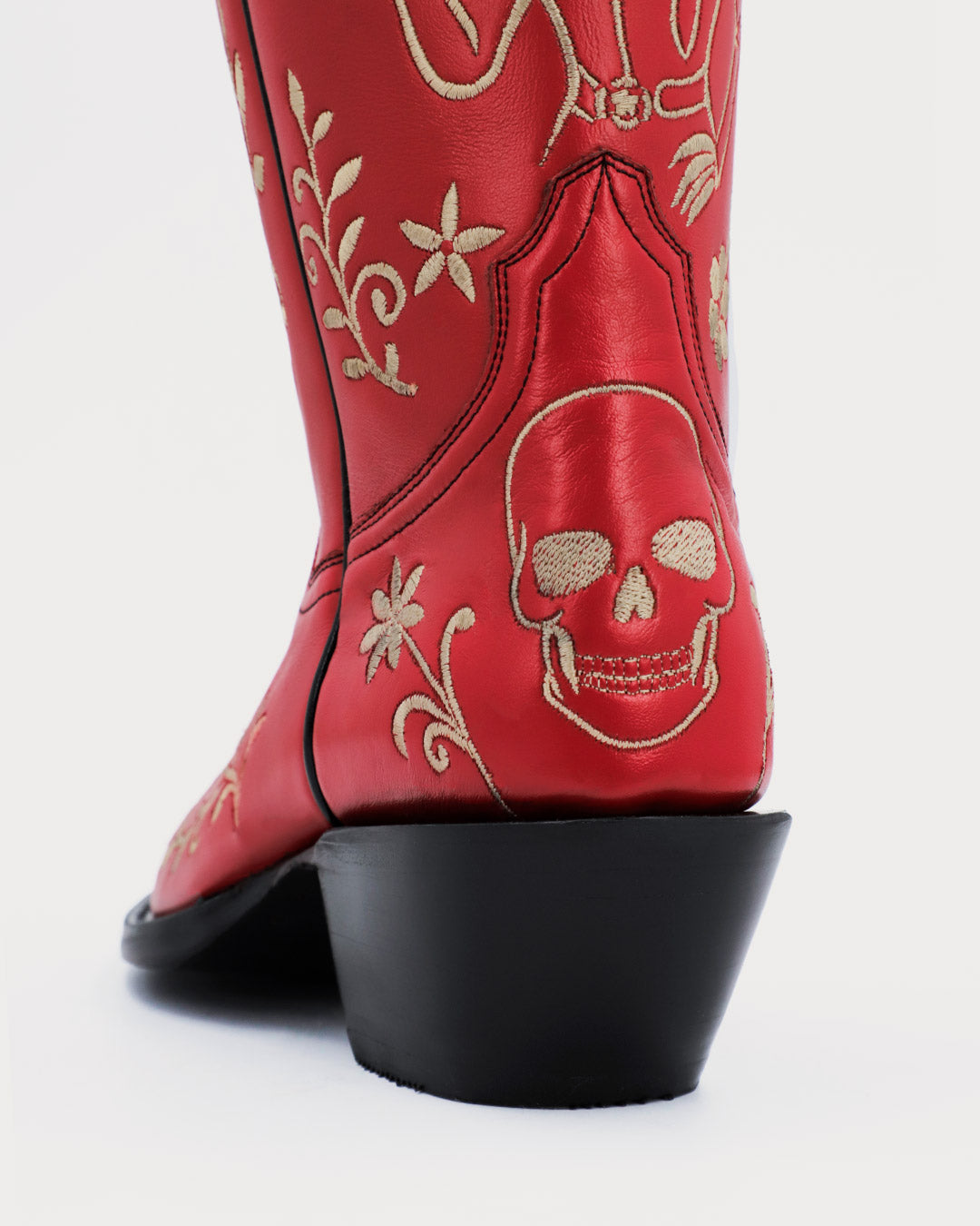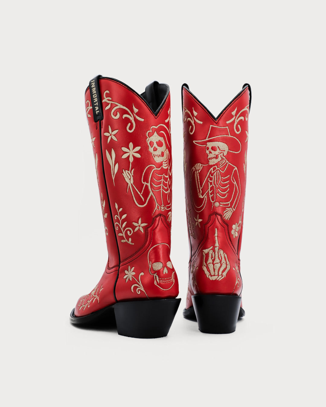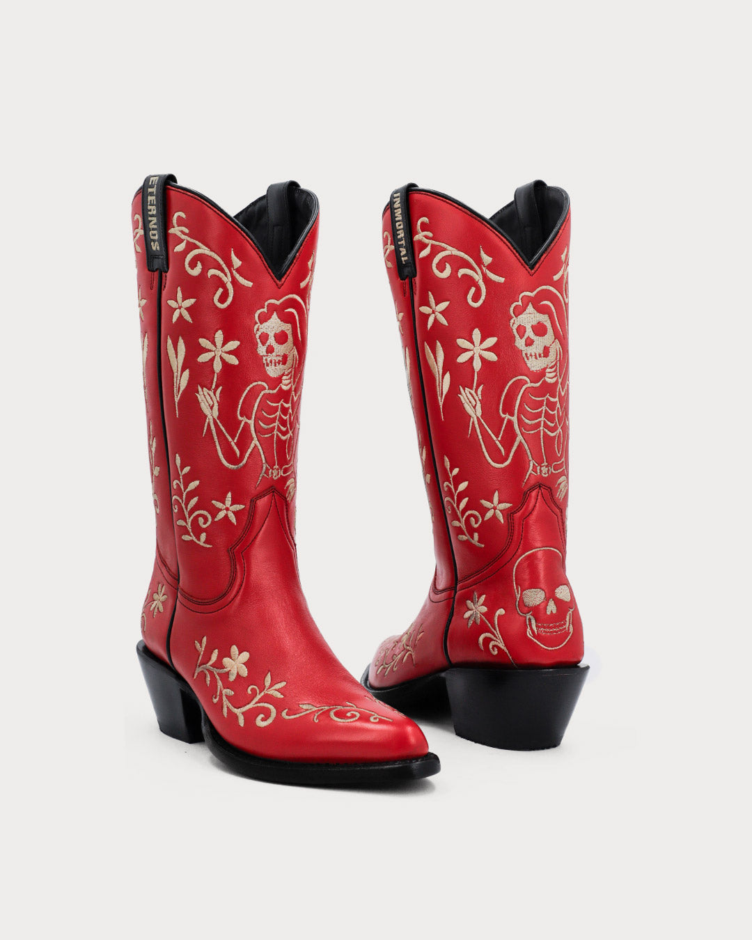 Eterna es una bota de edición limitada, creada para conmemorar la temporada de octubre e inspirada en la esencia del Día de Muertos. Elaborada en piel color rojo cereza, con un bordado en tono arena que resalta su diseño y refleja el contraste entre lo eterno y lo terrenal.