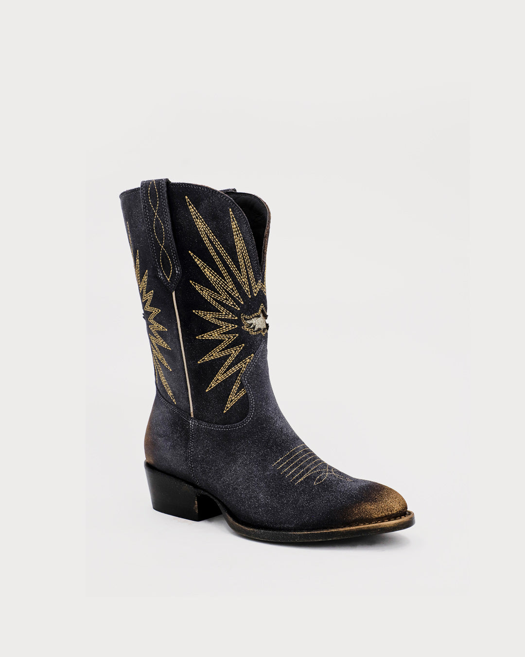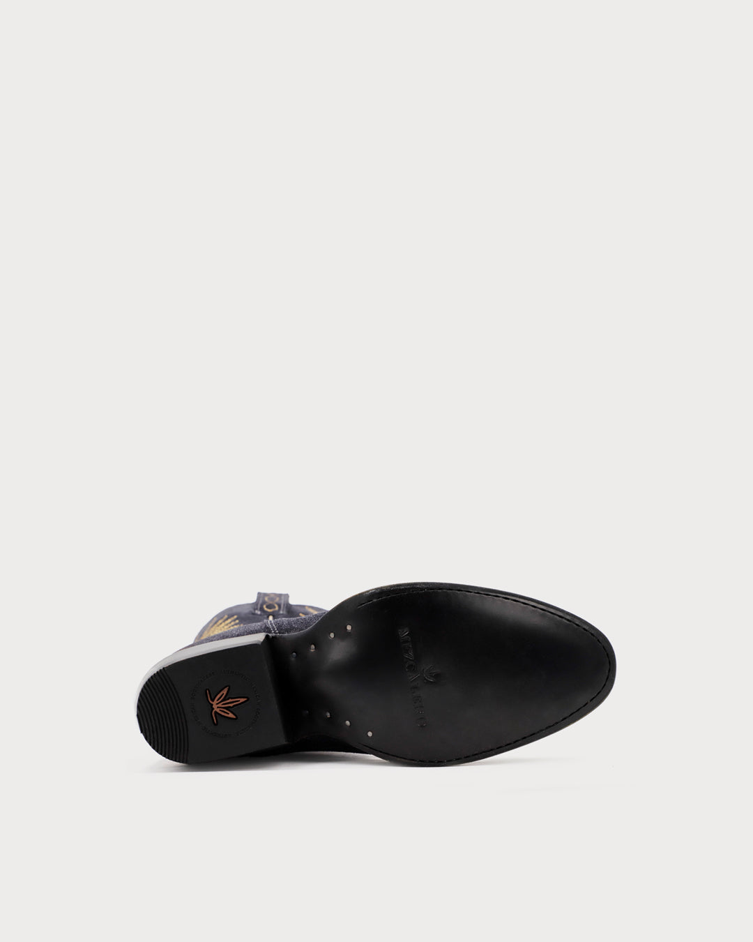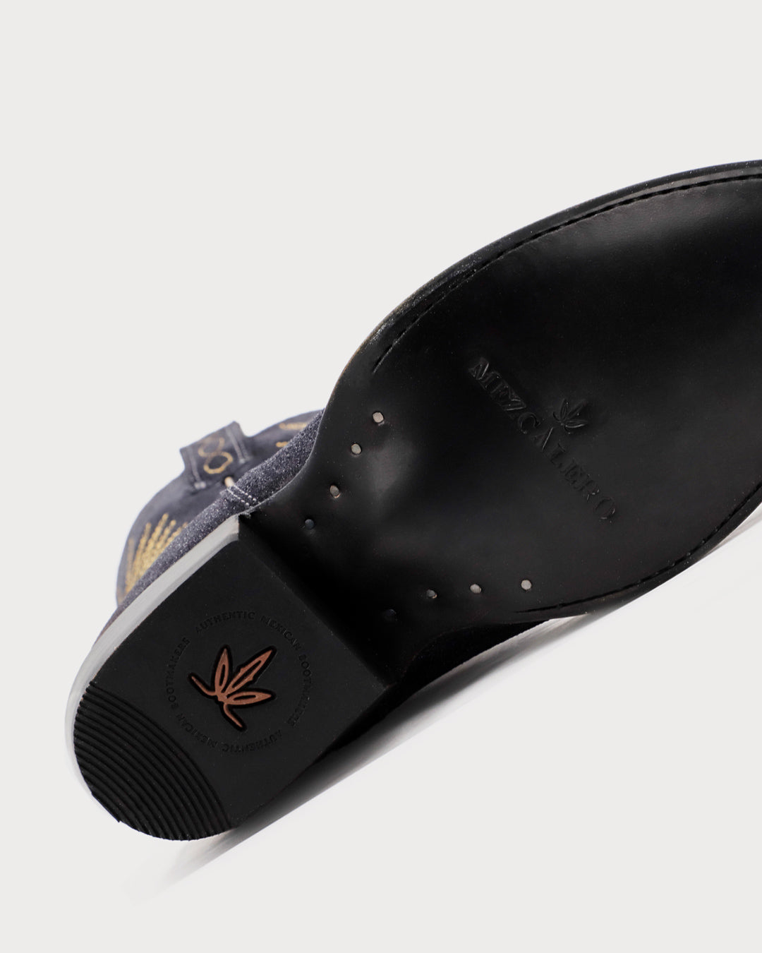 La reinterpretación de un ícono. Mezcalero Boots presenta una edición especial de la silueta Mezcal, ahora en fina gamuza azul que asimila al denim. La base incorpora un acabado de glitter resistente al agua, mientras el bordado en hilo dorado resalta la estructura con un trazo preciso.