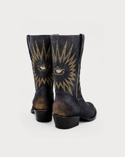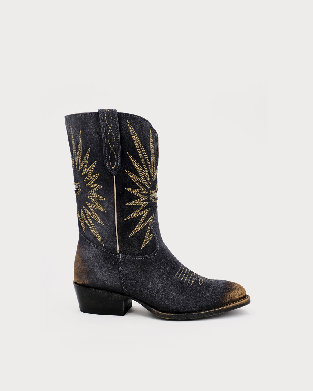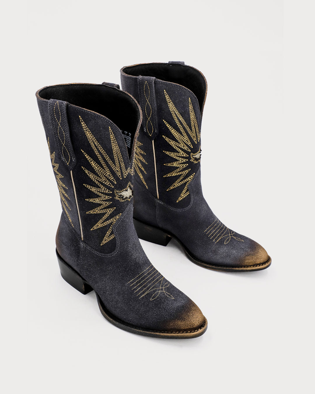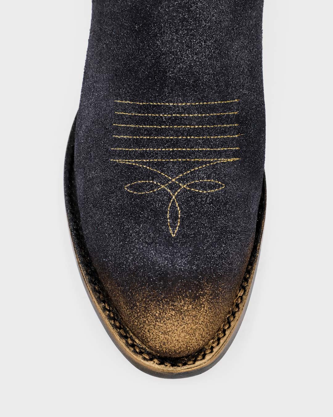 La reinterpretación de un ícono. Mezcalero Boots presenta una edición especial de la silueta Mezcal, ahora en fina gamuza azul que asimila al denim. La base incorpora un acabado de glitter resistente al agua, mientras el bordado en hilo dorado resalta la estructura con un trazo preciso.
