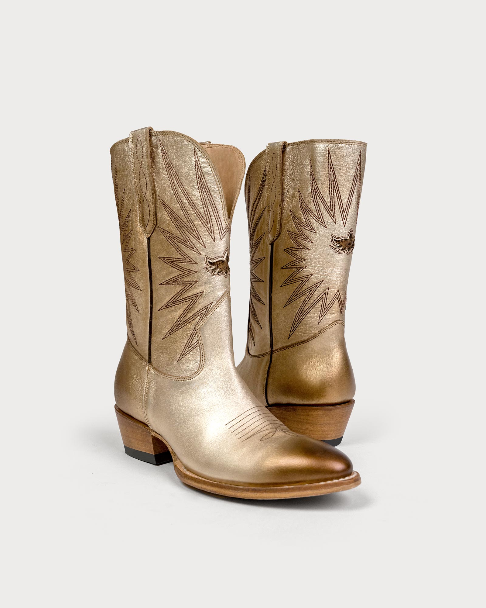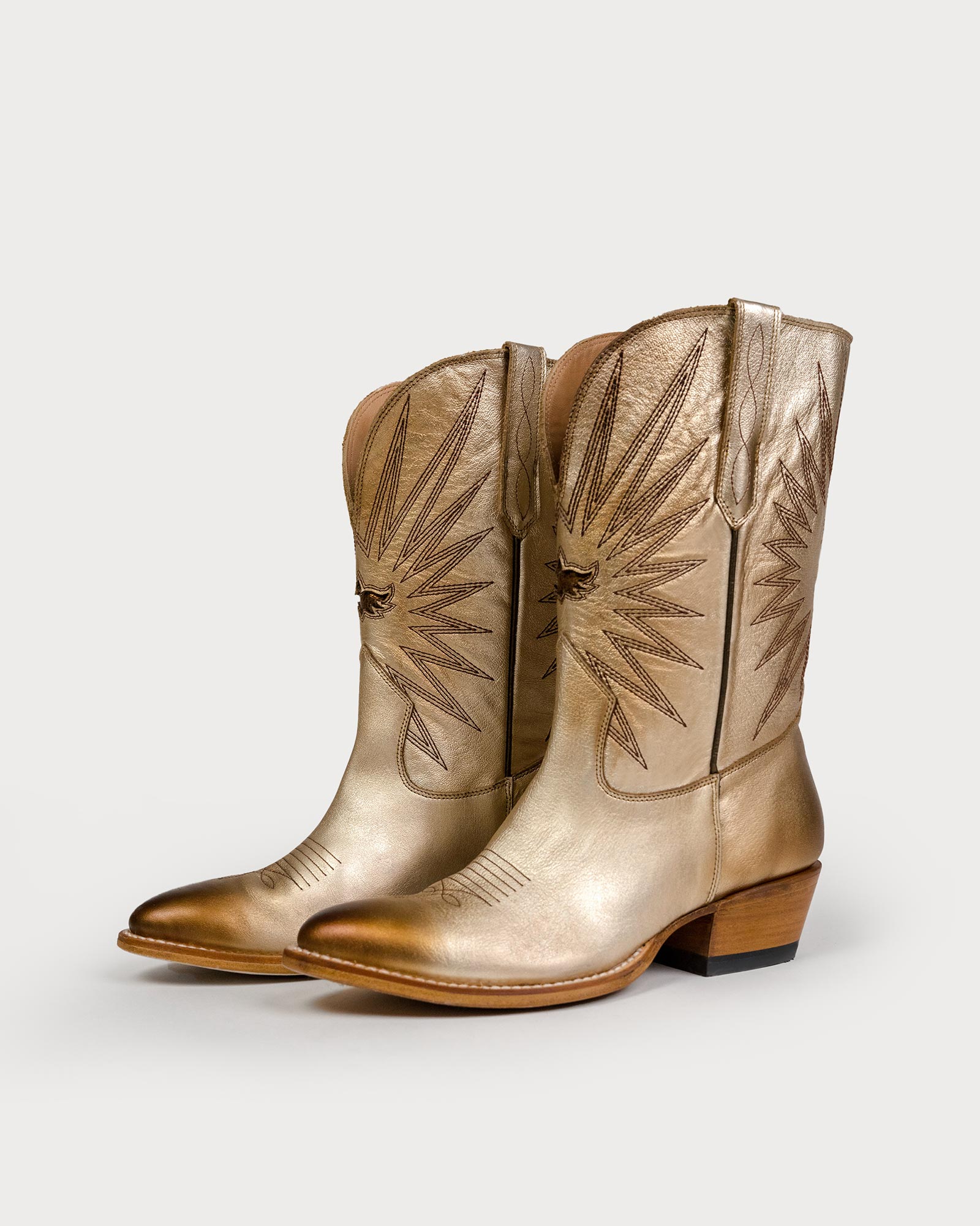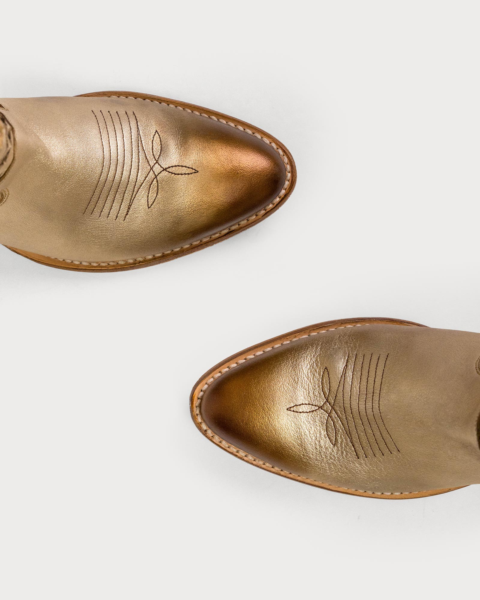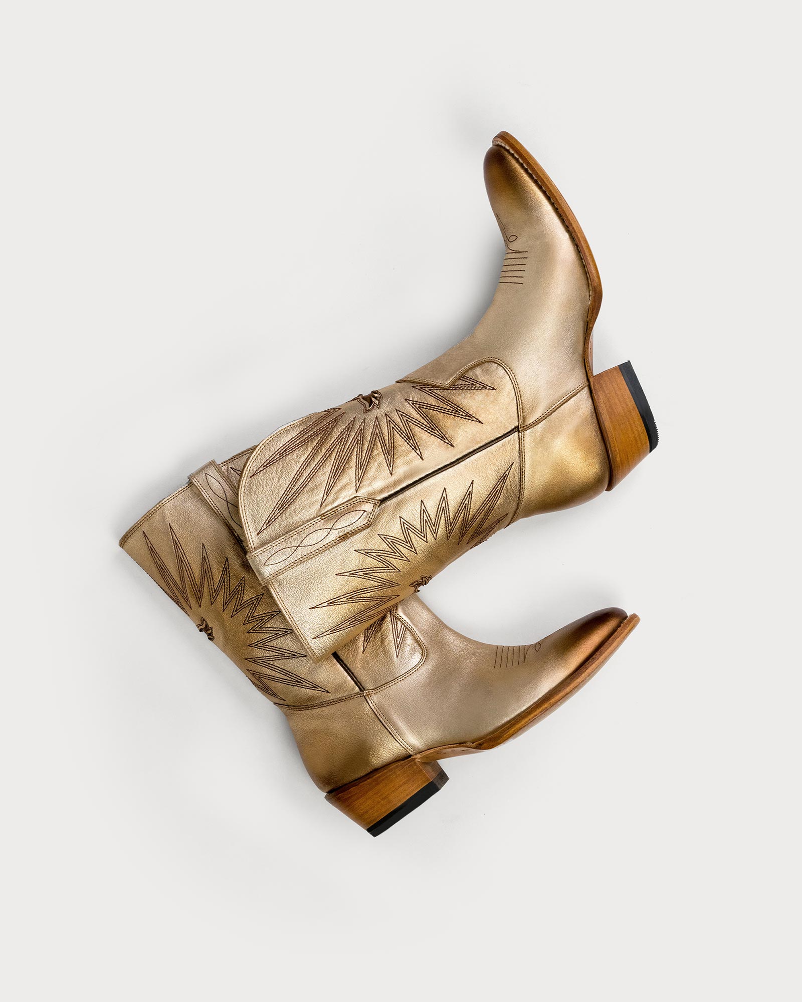 Mezcal True Gold, un par de botas de piel para mujer que en su contrucción retoman la estructura del mismo modelo al que su nombre inspira. En piel de tono dorado metálico con bordado en tubo y acabados a mano hechos por artesanos.