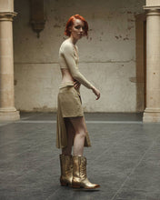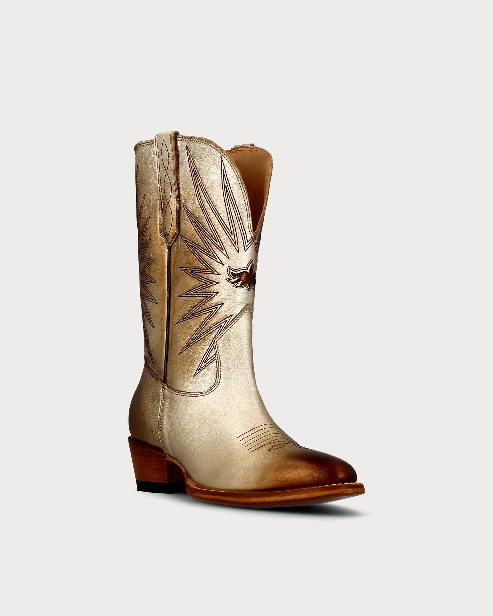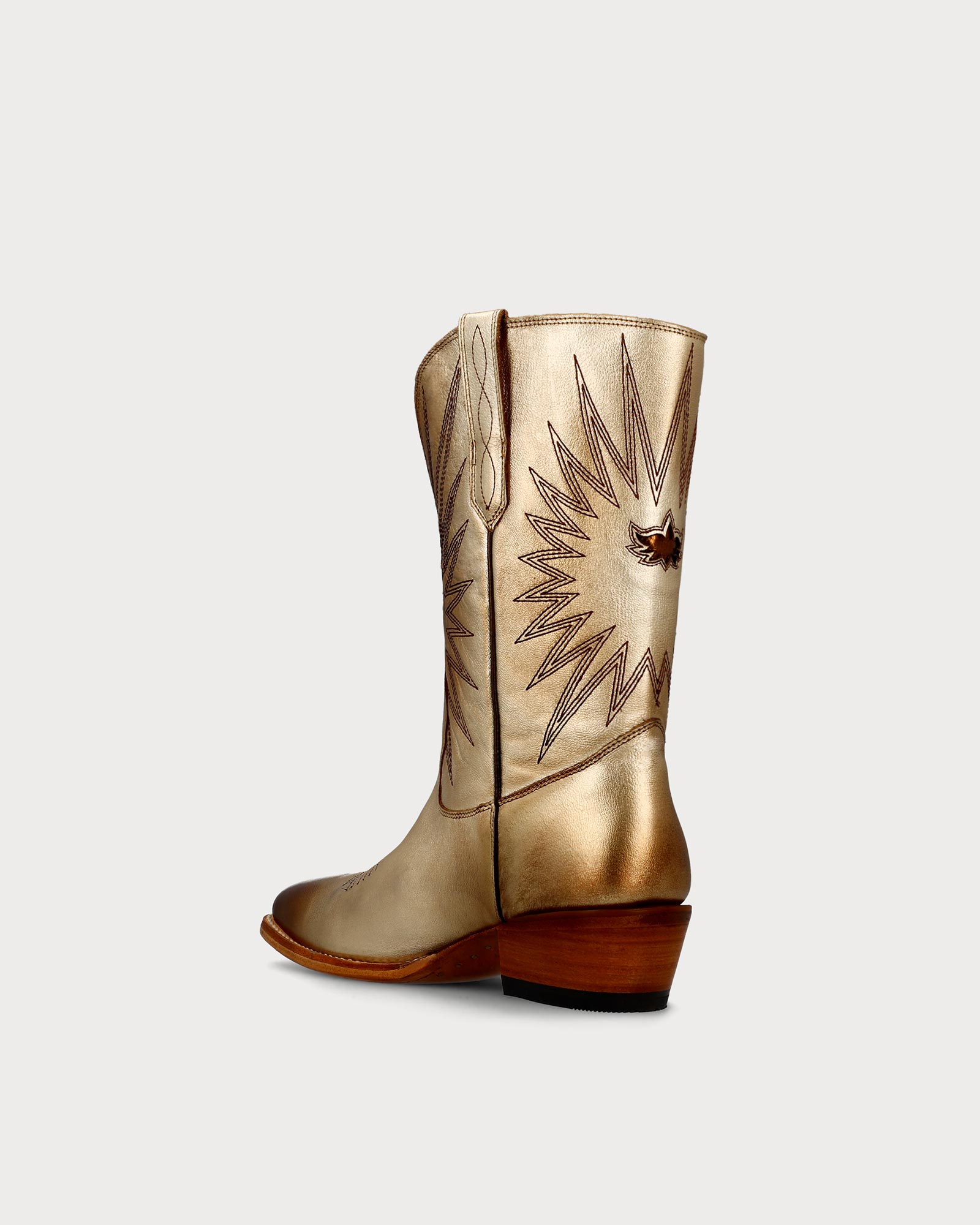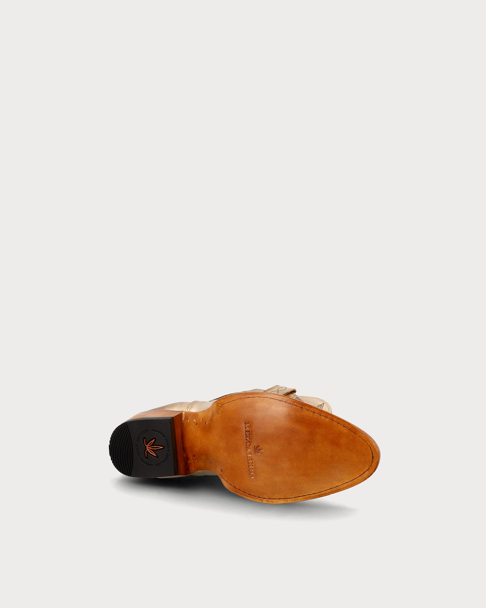 Mezcal True Gold, un par de botas de piel para mujer que en su contrucción retoman la estructura del mismo modelo al que su nombre inspira. En piel de tono dorado metálico con bordado en tubo y acabados a mano hechos por artesanos.