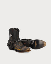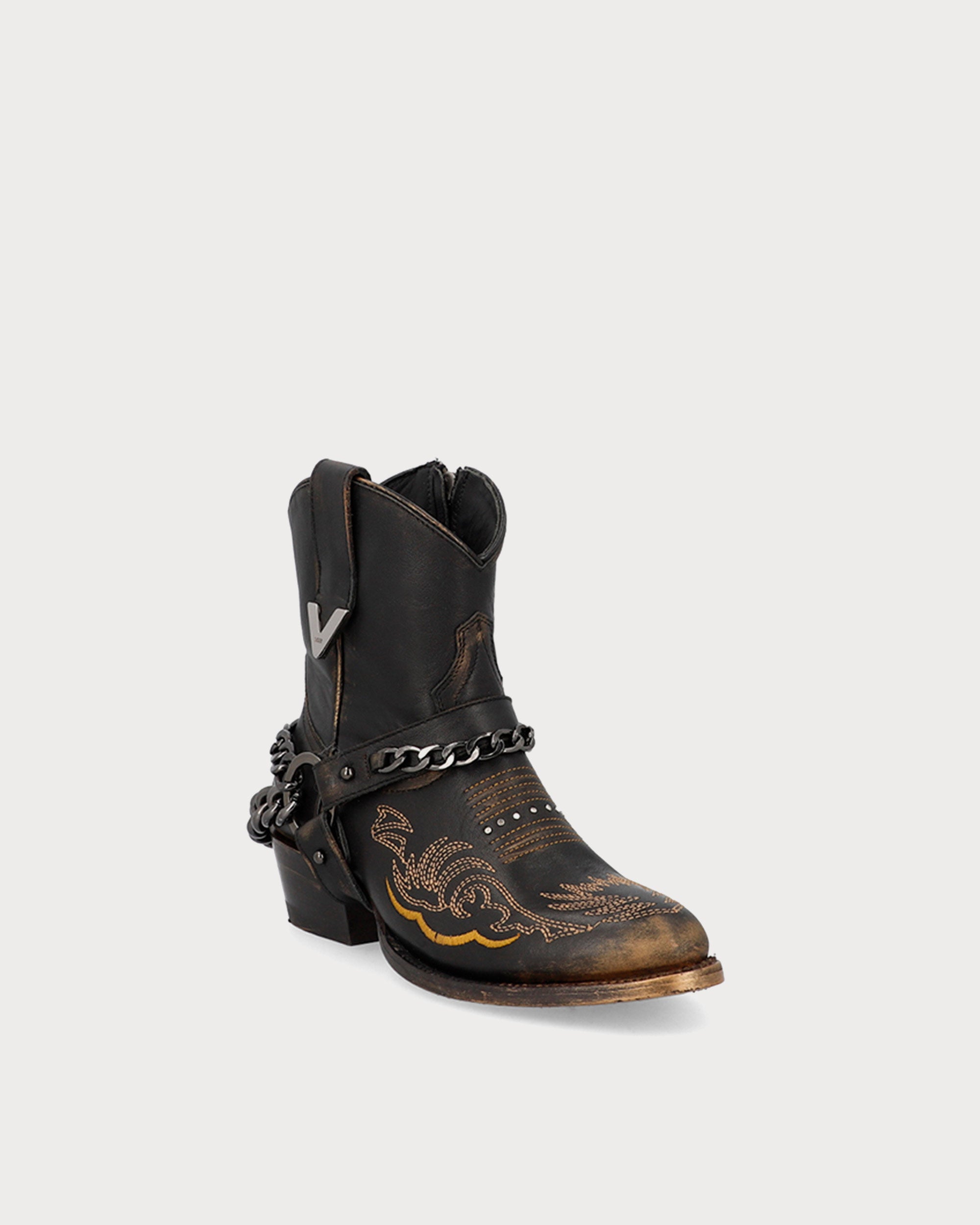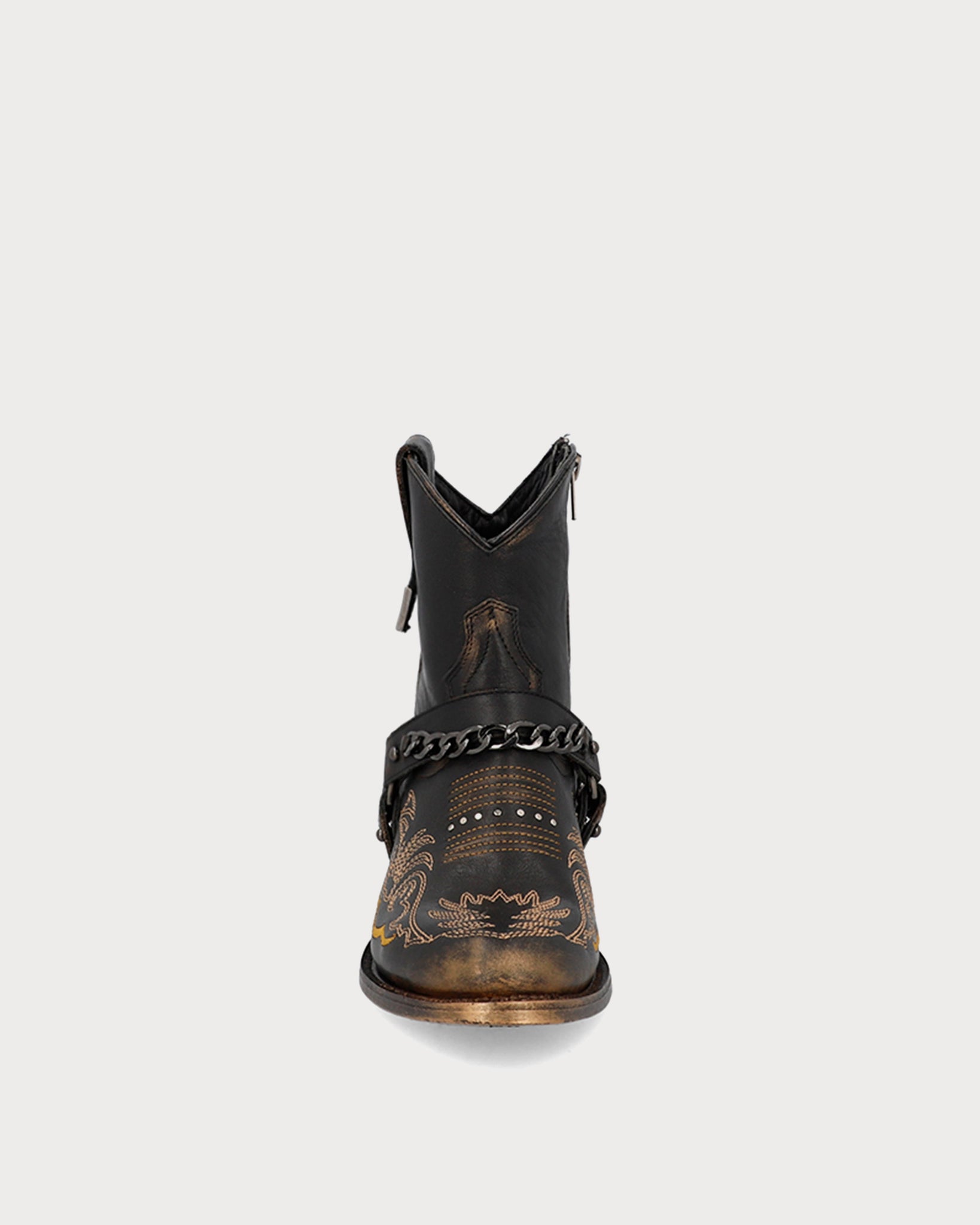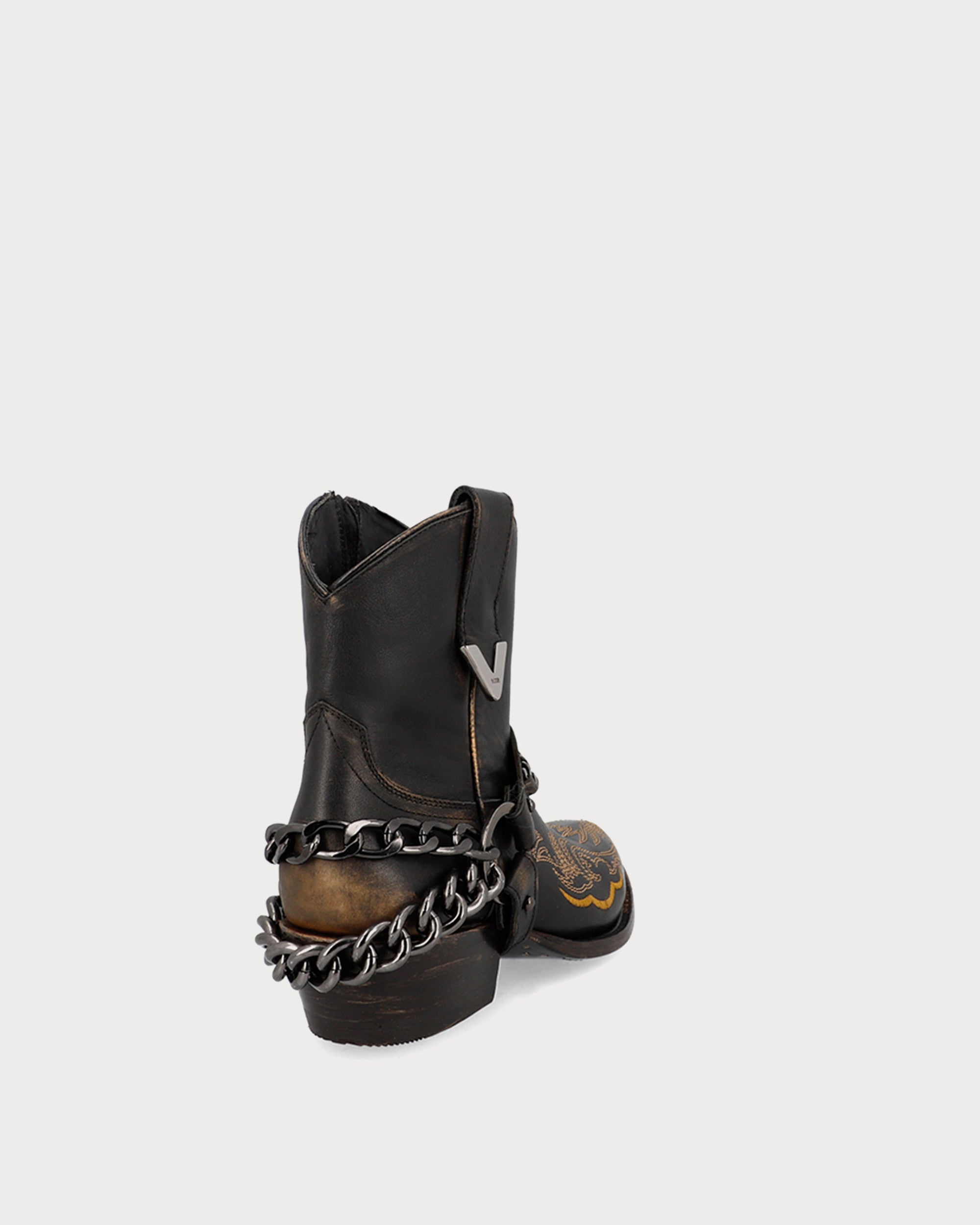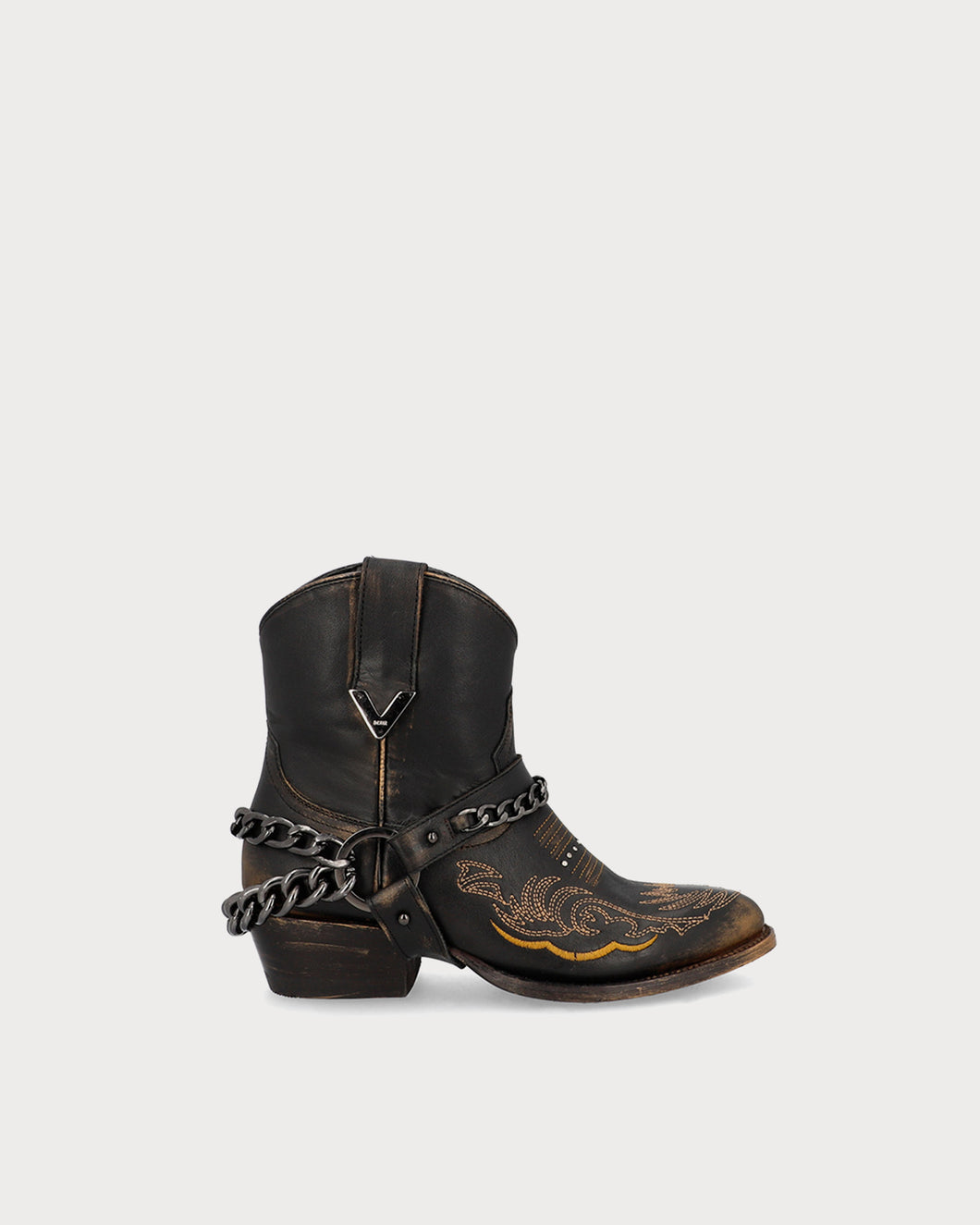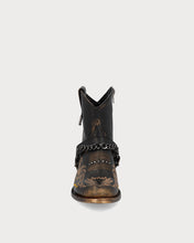 Miley Stone Moka, botín de piel lisa en una base color moka y detalles en gold brush que suman a un estilo irreverente. A cada centímetro se agrego un detalle que continua un ritmo uniforme desde el estibro, stitching en tono mostaza y cadenas en níquel oscuro.