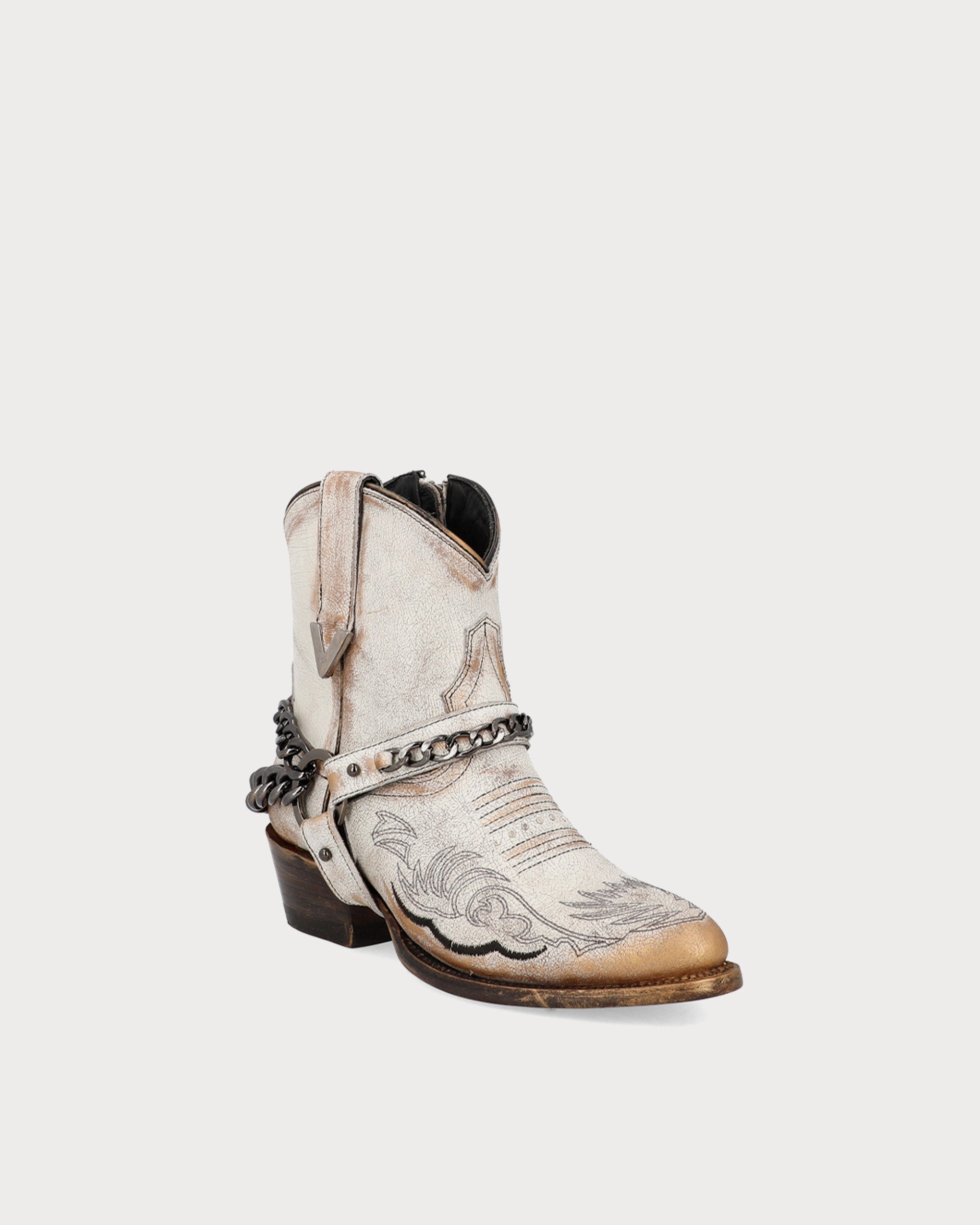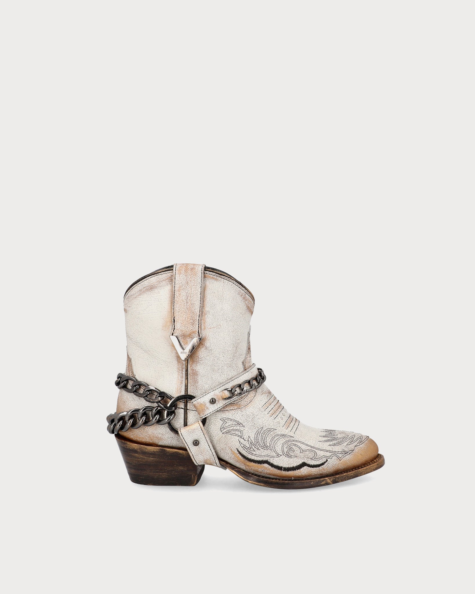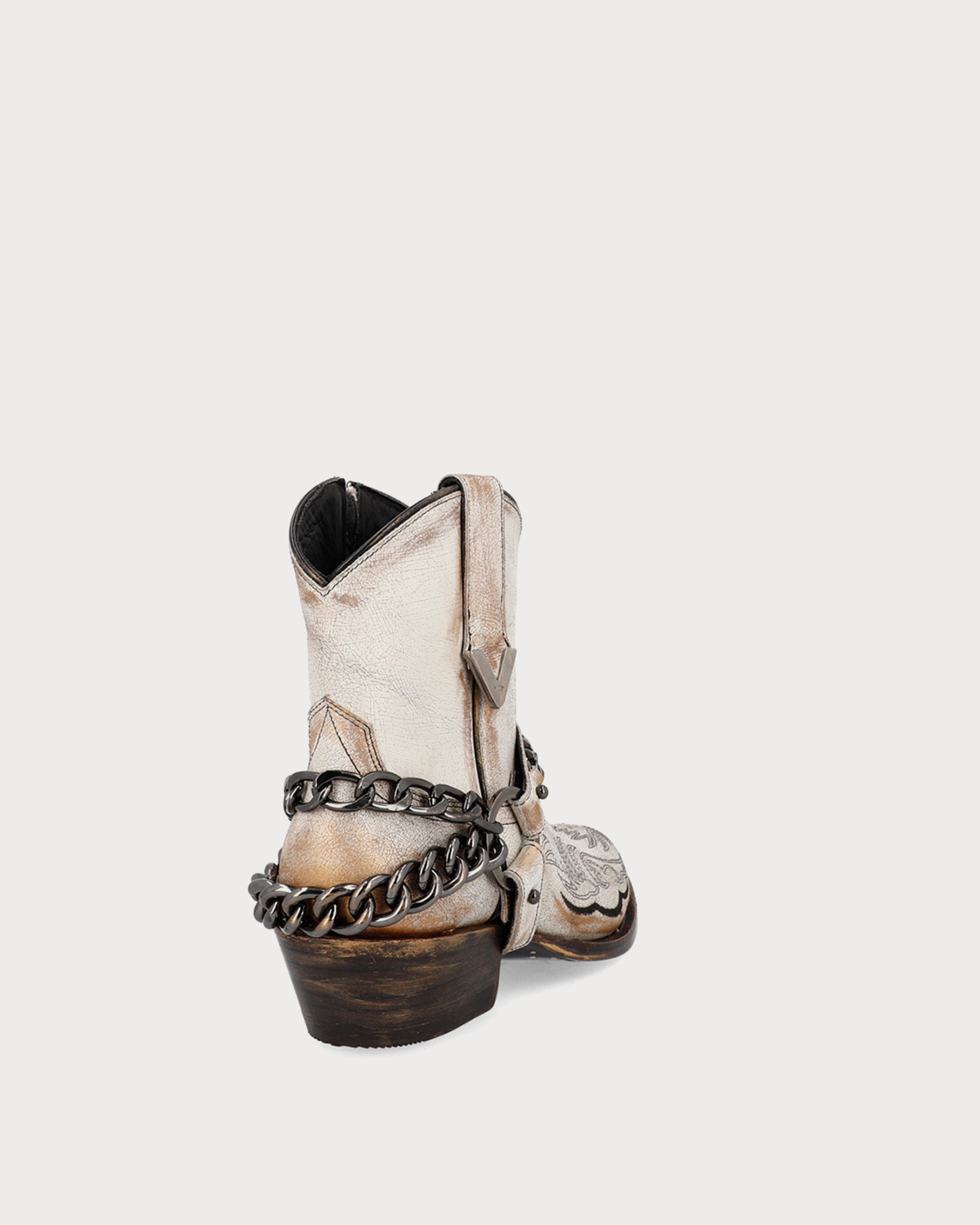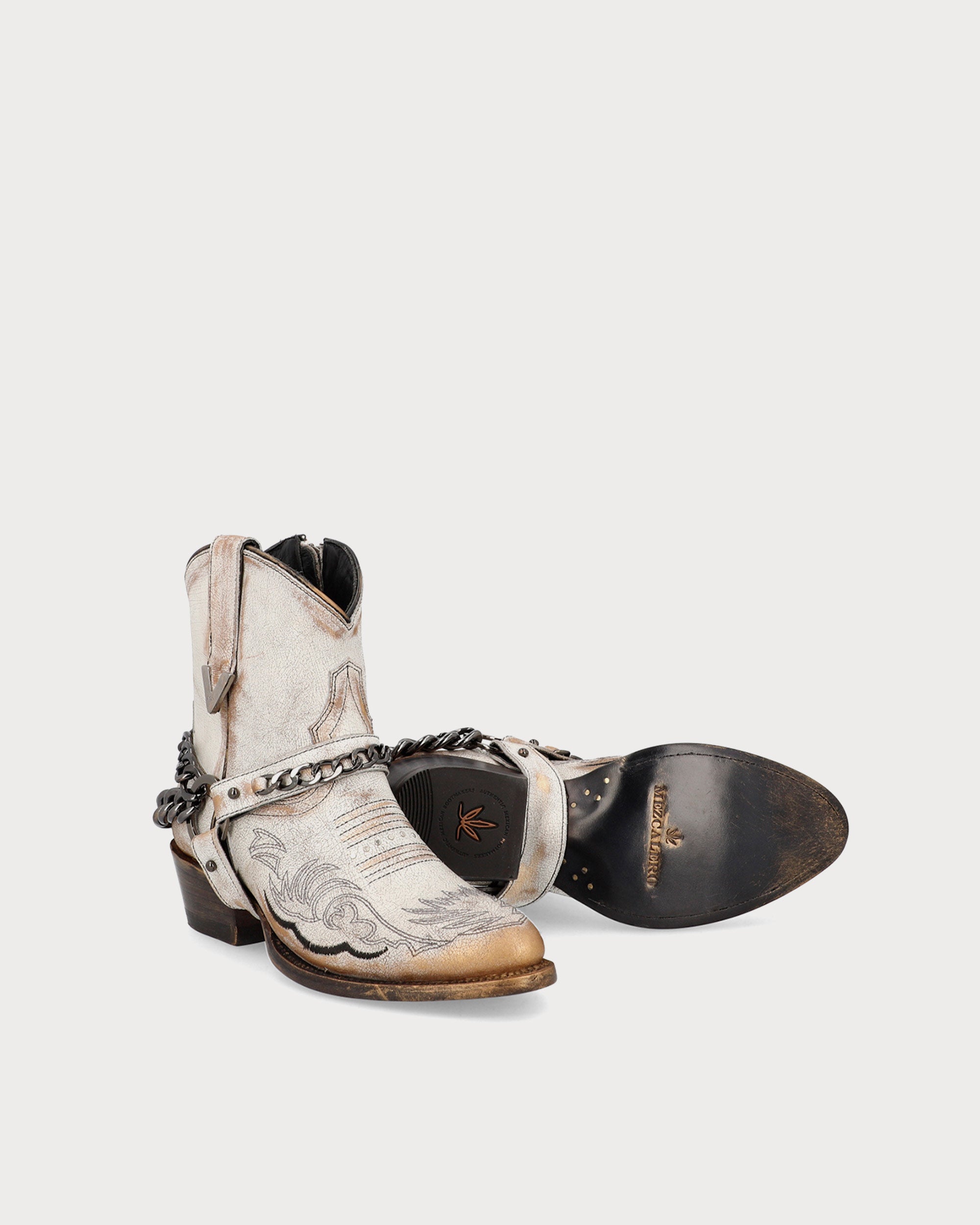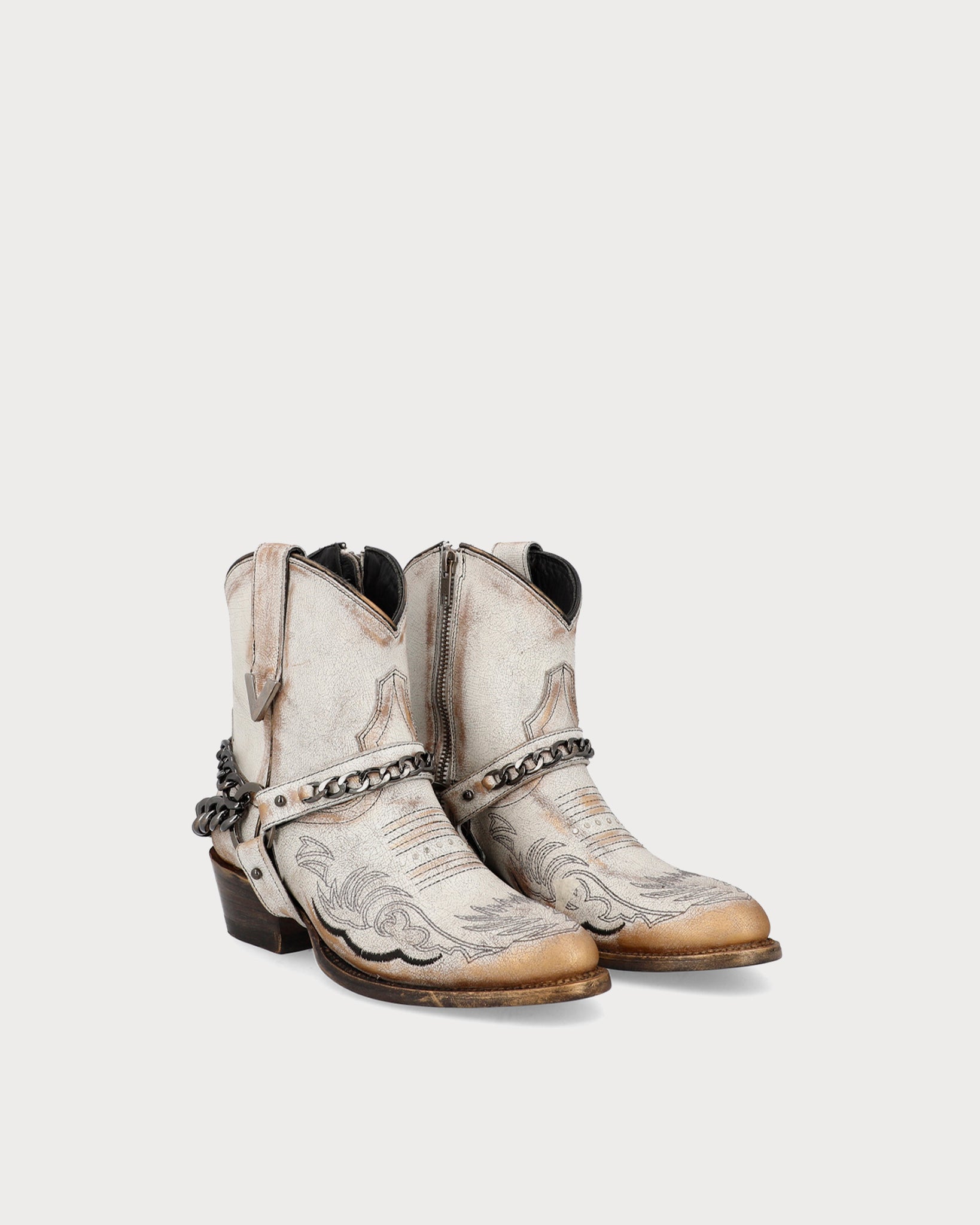 Miley White, botín de piel con textura crackelada y acabado avejentado en una base color hueso cálido y detalles en gold bruch que suman a un estilo irreverente. A cada centímetro se agrego un detalle que continua un ritmo uniforme desde el estibro, stitching y cadenas en níquel oscuro.